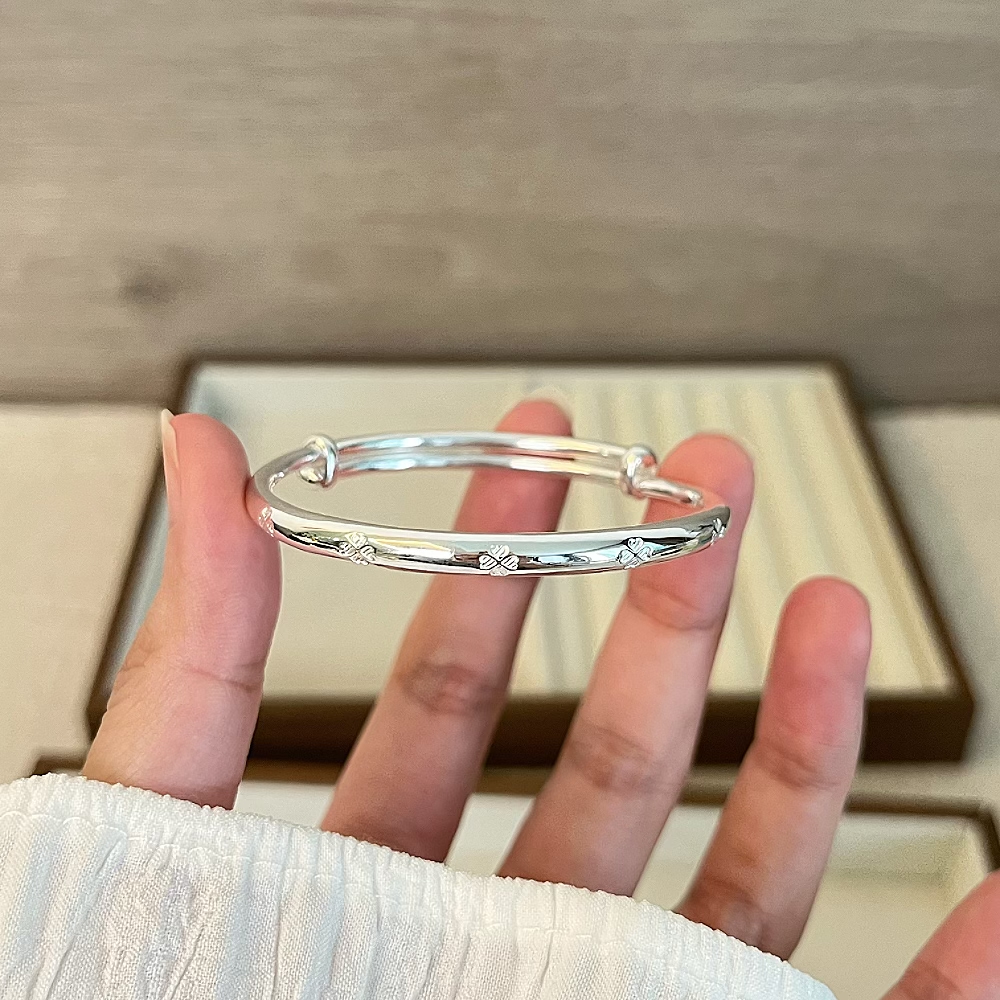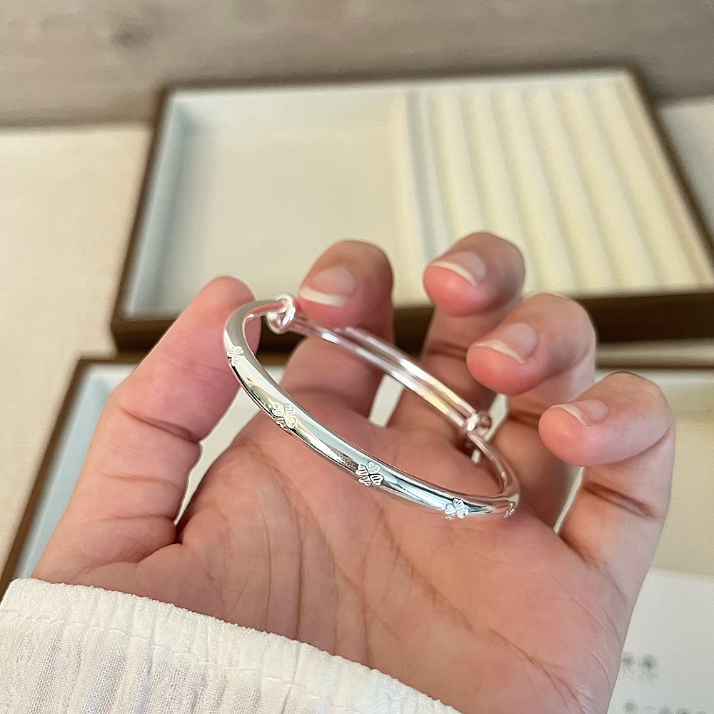 Weight: Approximately 18g Hallmark: Pure Silver 999.9 Certification: Each piece is accompanied by an official silver certification Type: Adjustable-pull bangle (Junior) Suitable Wrist Size: Fits smaller than 14cm wrists 克重:约 18g 钢印:足银999.9 证书:每一件均附国家级认证证书 款式:推拉手镯(中童) 适合手围:适用于小于14cm手围
