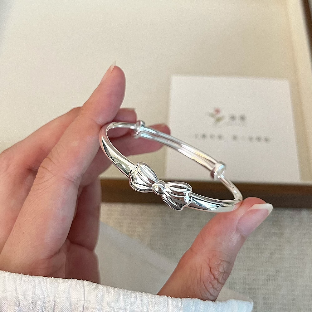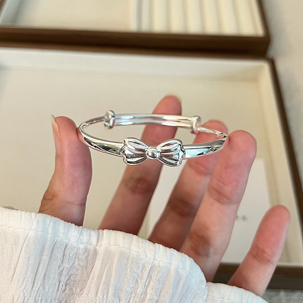 Weight: Approximately 15g Hallmark: Pure Silver 999.9 Certification: Each piece is accompanied by an official silver certification Type: Adjustable-pull bangle (Junior) Suitable Wrist Size: Fits smaller than 14cm wrists 克重:约 15g 钢印:足银999.9 证书:每一件均附国家级认证证书 款式:推拉手镯(中童) 适合手围:适用于小于14cm手围